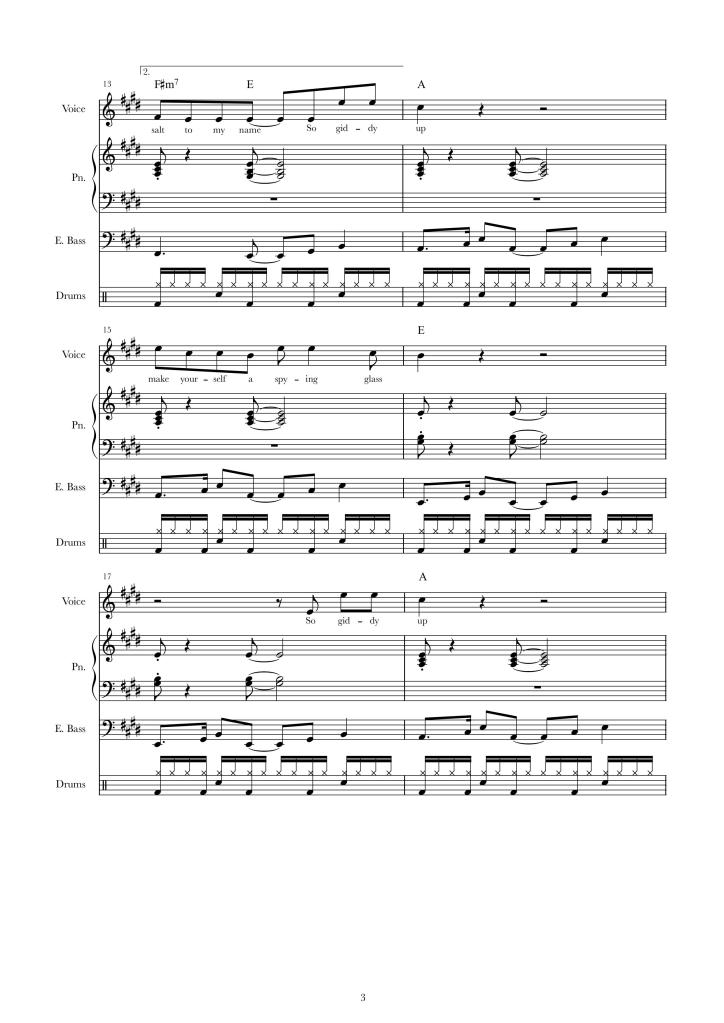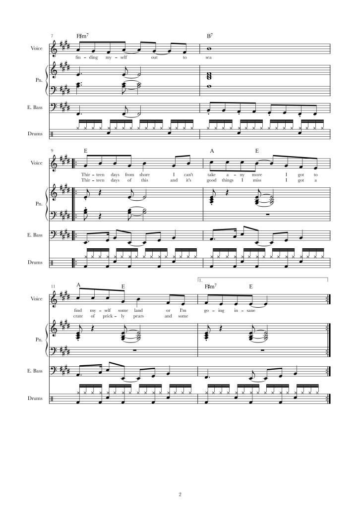 The passing of the storm is a catharsis and with the becalming of the ocean comes an era of spiritual renewal and creative expression. Broken up by their transports the band work on new material in a makeshift way. “What is that, F?” Frank yells at Jack across the water. “D minor!” Jack responds. “Are we even in tune?” yells Frank. “Bob, can you give us an E?” Bob blows the note out of his horn and Jack and Frank tune their strings to the sound waves in the wind that constitute it.